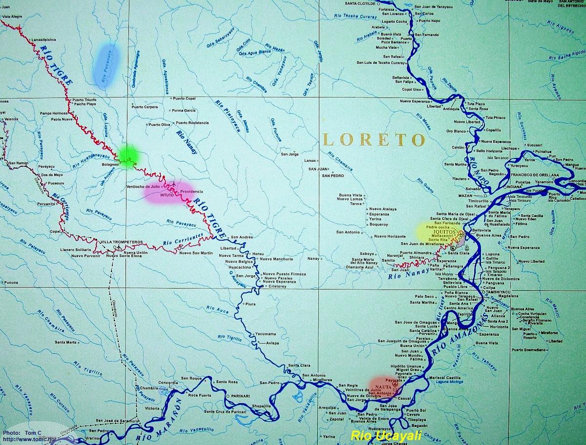The revised plan: To go from Iquitos (Marked yellow on the map) to Nauta (Marked red) by a car (the only road in the entire area), then by the rented boat from there and upstream the Río Tigre all the way to Intuto (Marked purple on the map), and from there to the mouth of the Río Pucacuro (Marked green on the map).